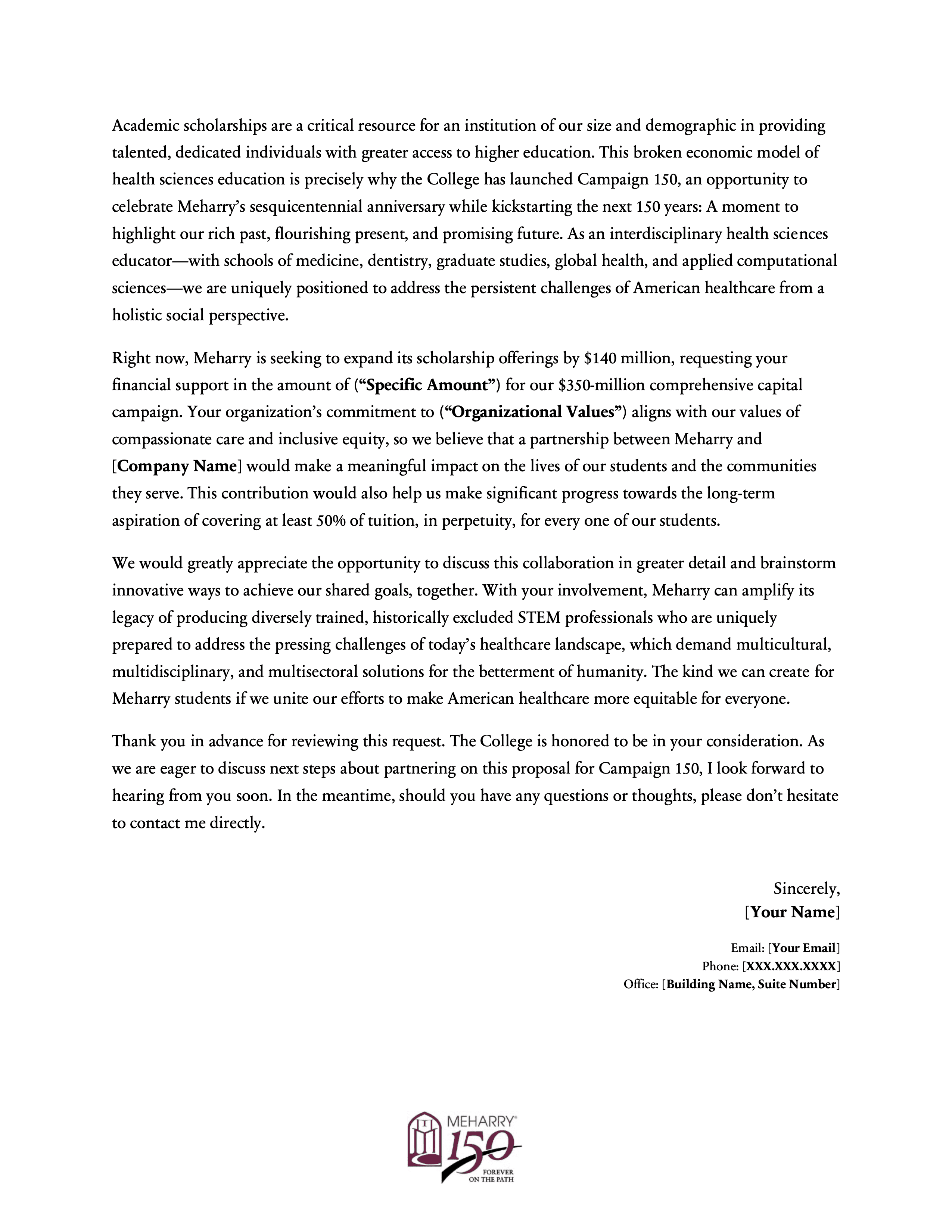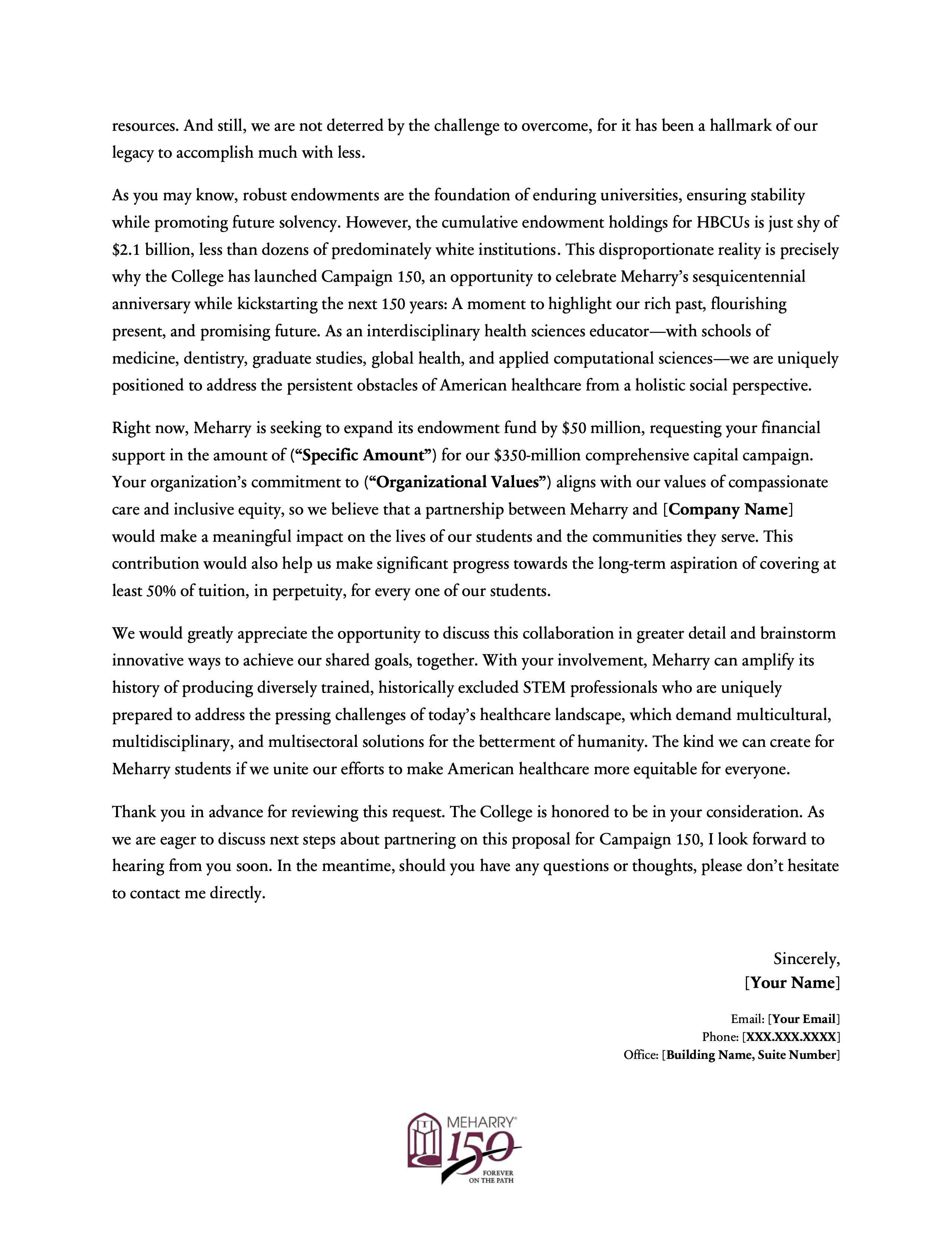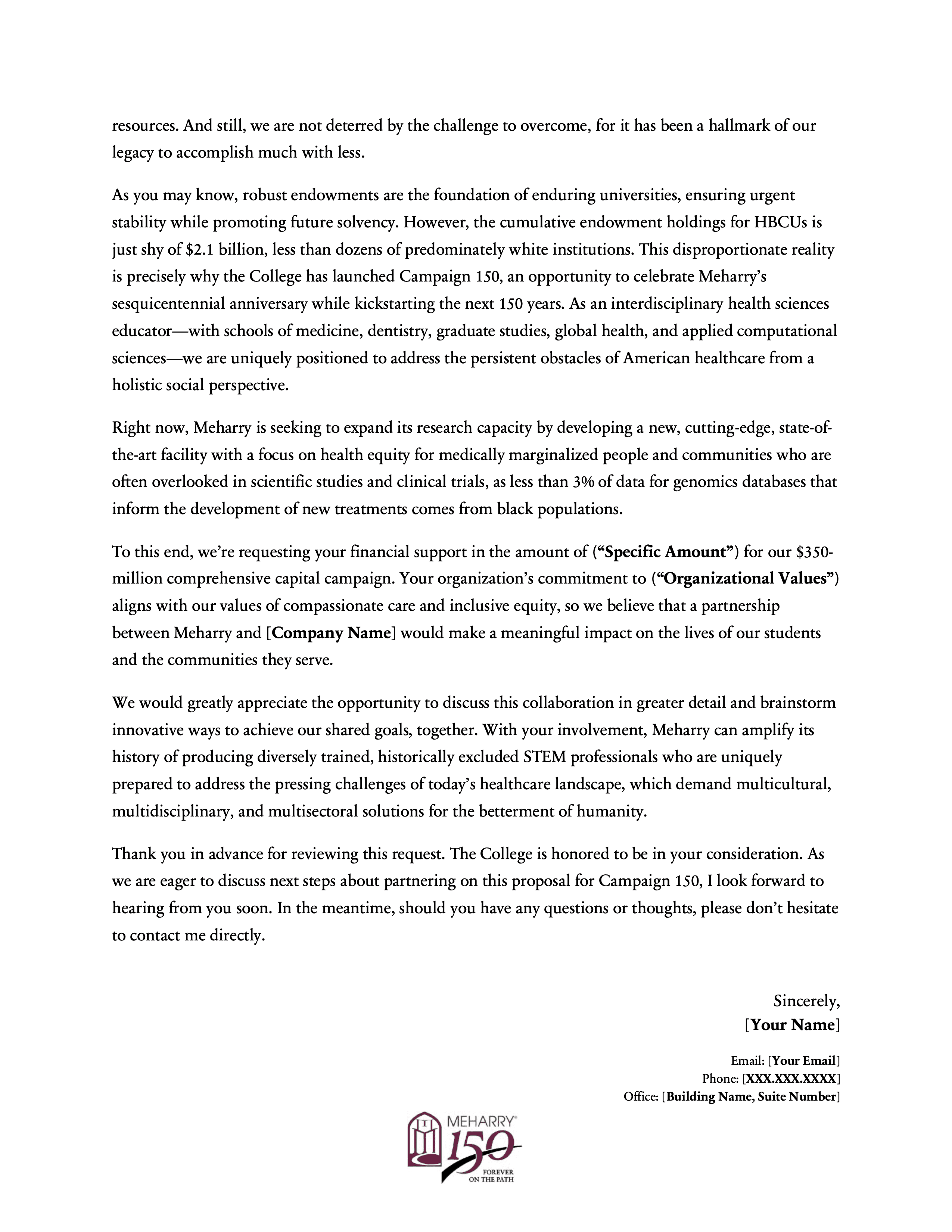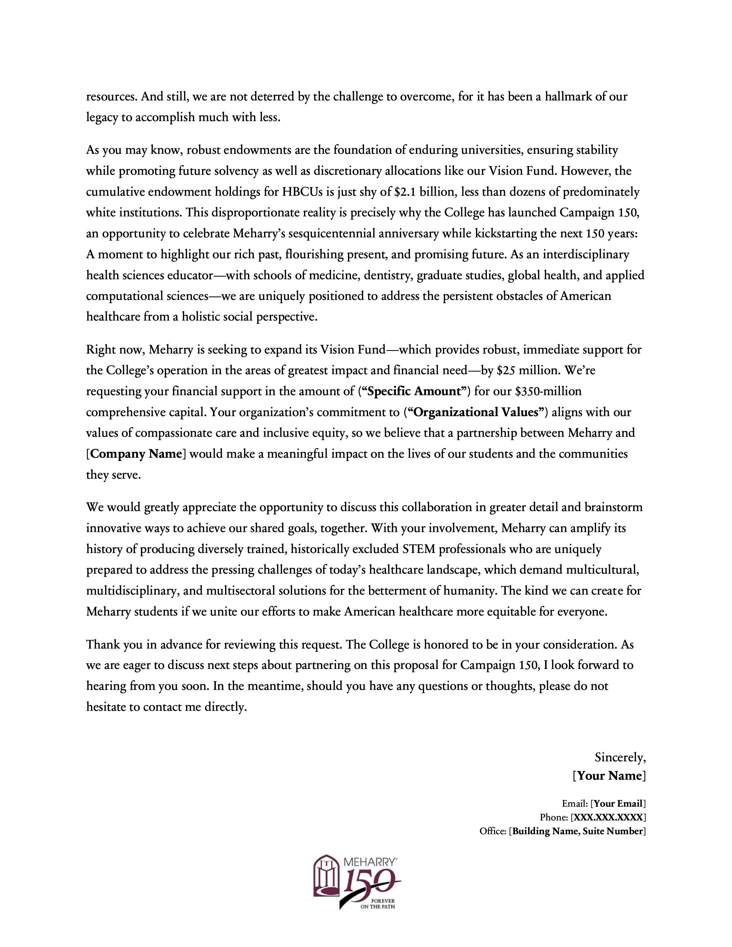 This project involved creating a modular series of six letters of inquiry for Meharry Medical College’s Campaign 150, each tailored to a distinct fundraising pillar: endowment, faculty support, program support, research facility development, scholarship support, and the Vision Fund. The series was designed to give development staff a flexible set of donor-facing templates that preserved institutional consistency while making it easier to customize outreach by funder interest, values alignment, and campaign priority. It reflects an approach to fundraising materials that emphasizes not just persuasive writing, but reusable messaging infrastructure that supports a broader advancement strategy.