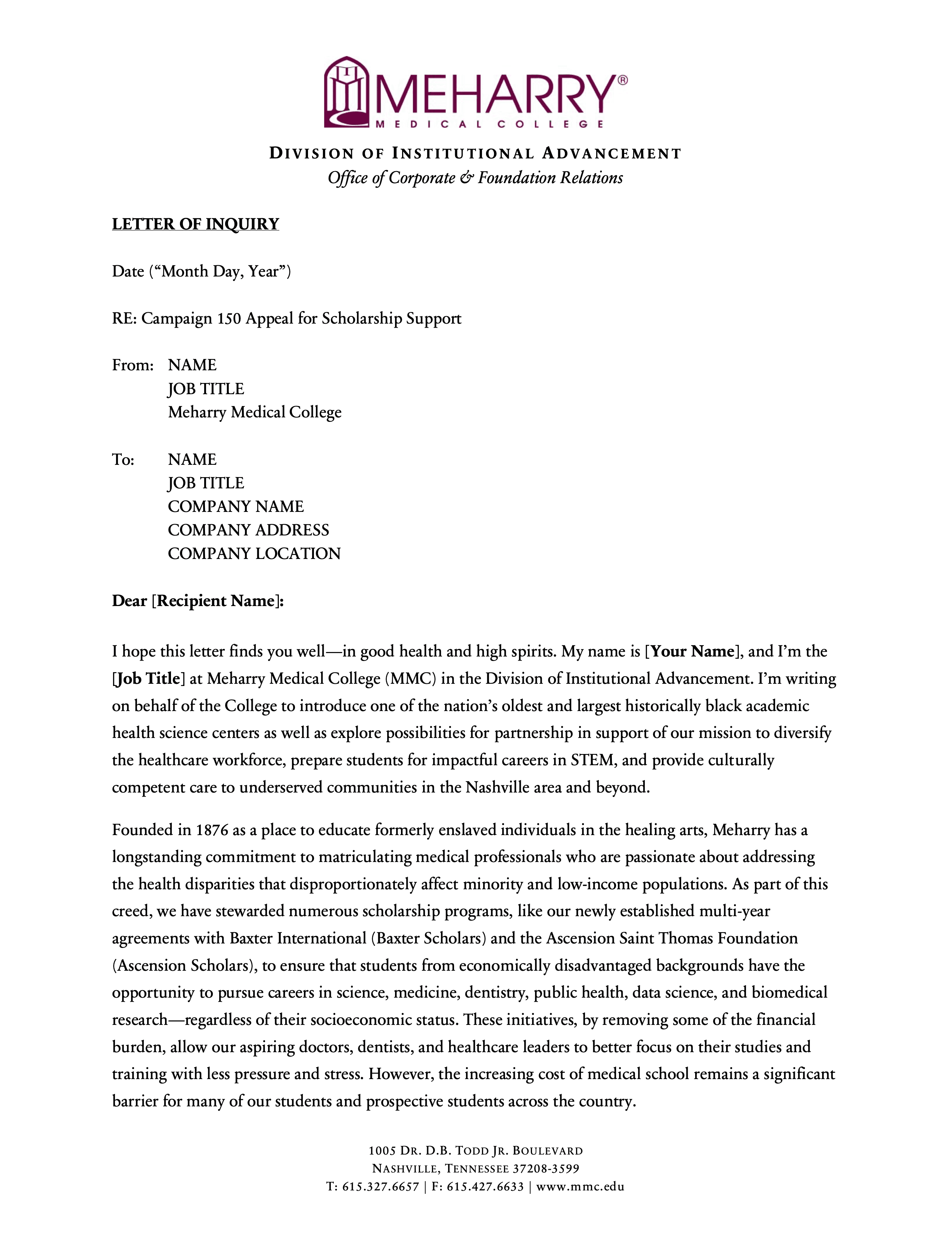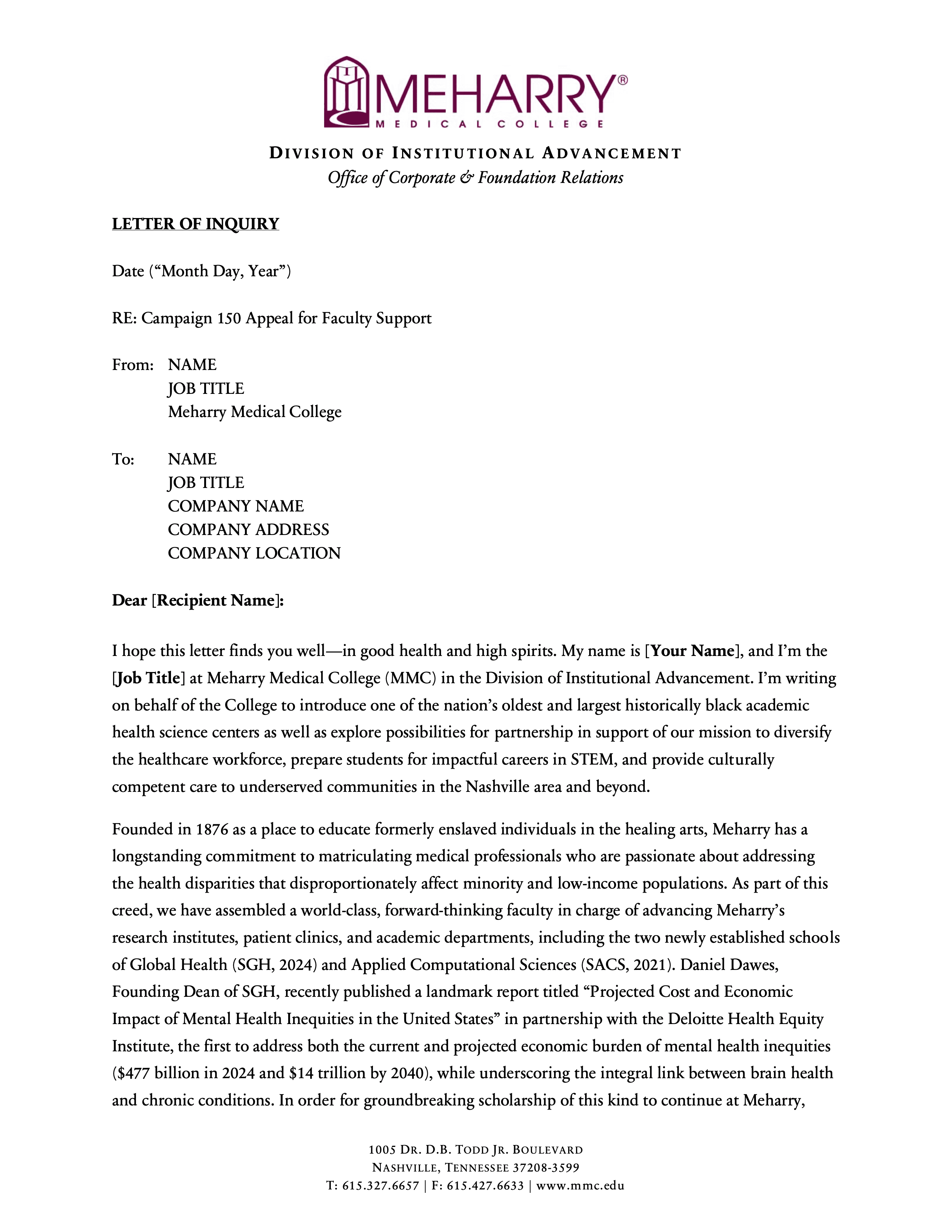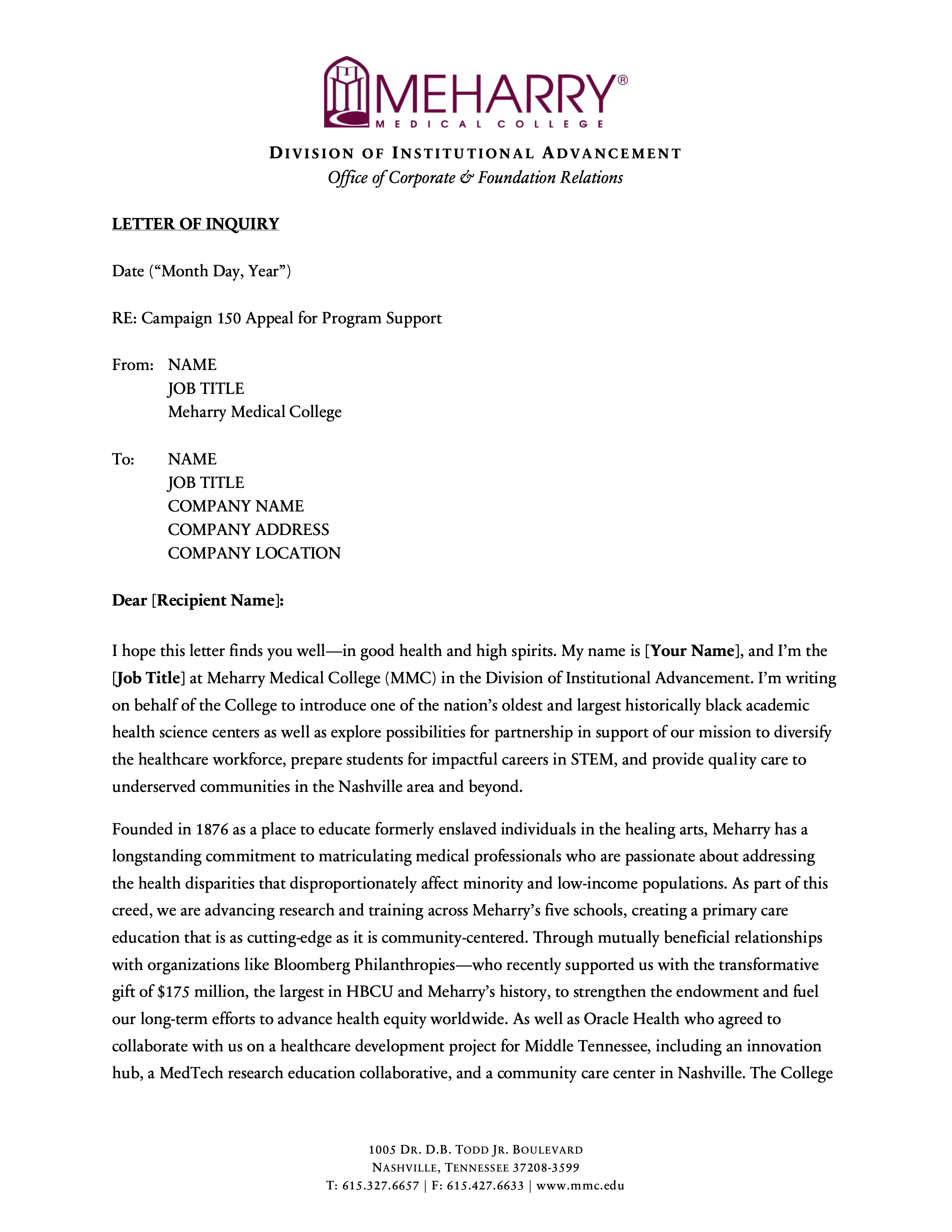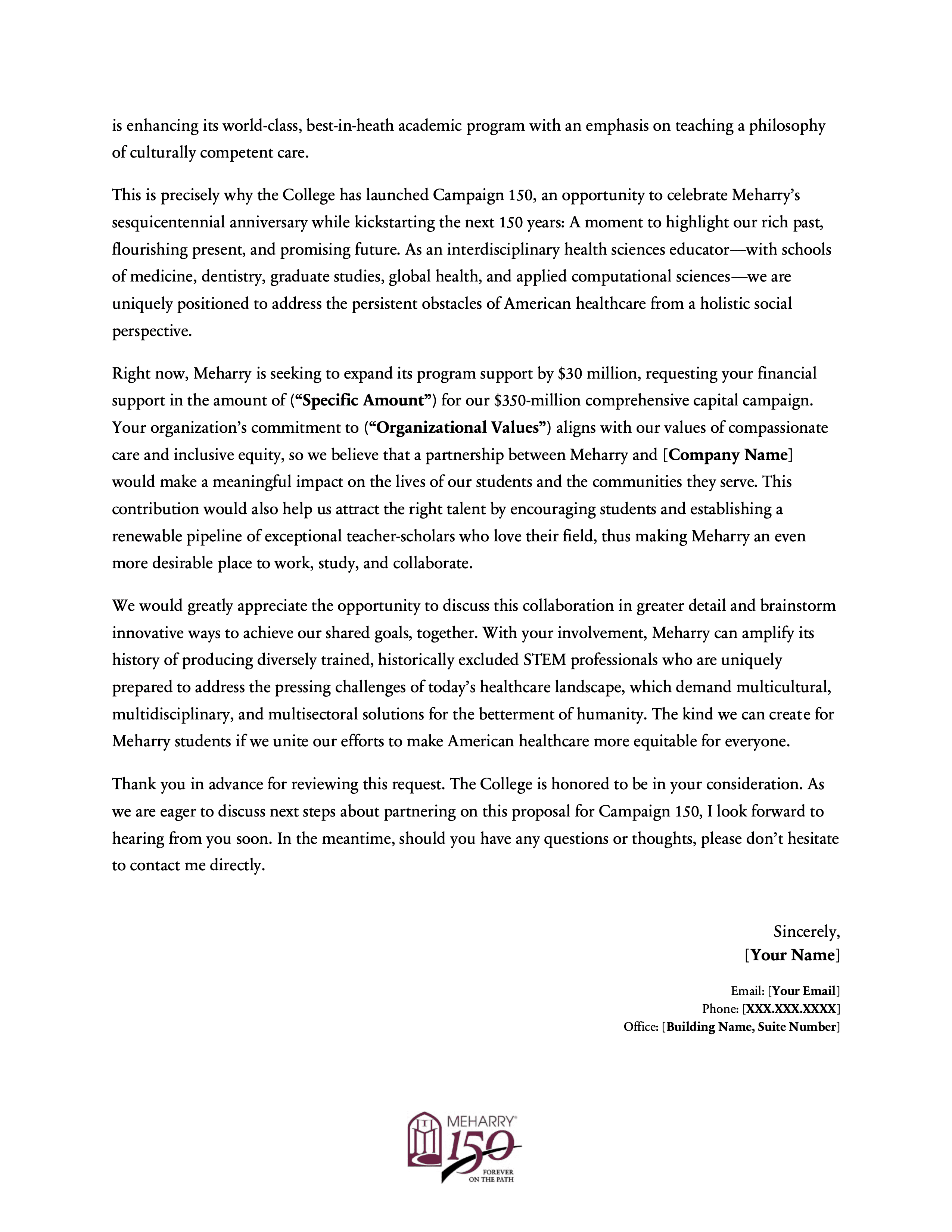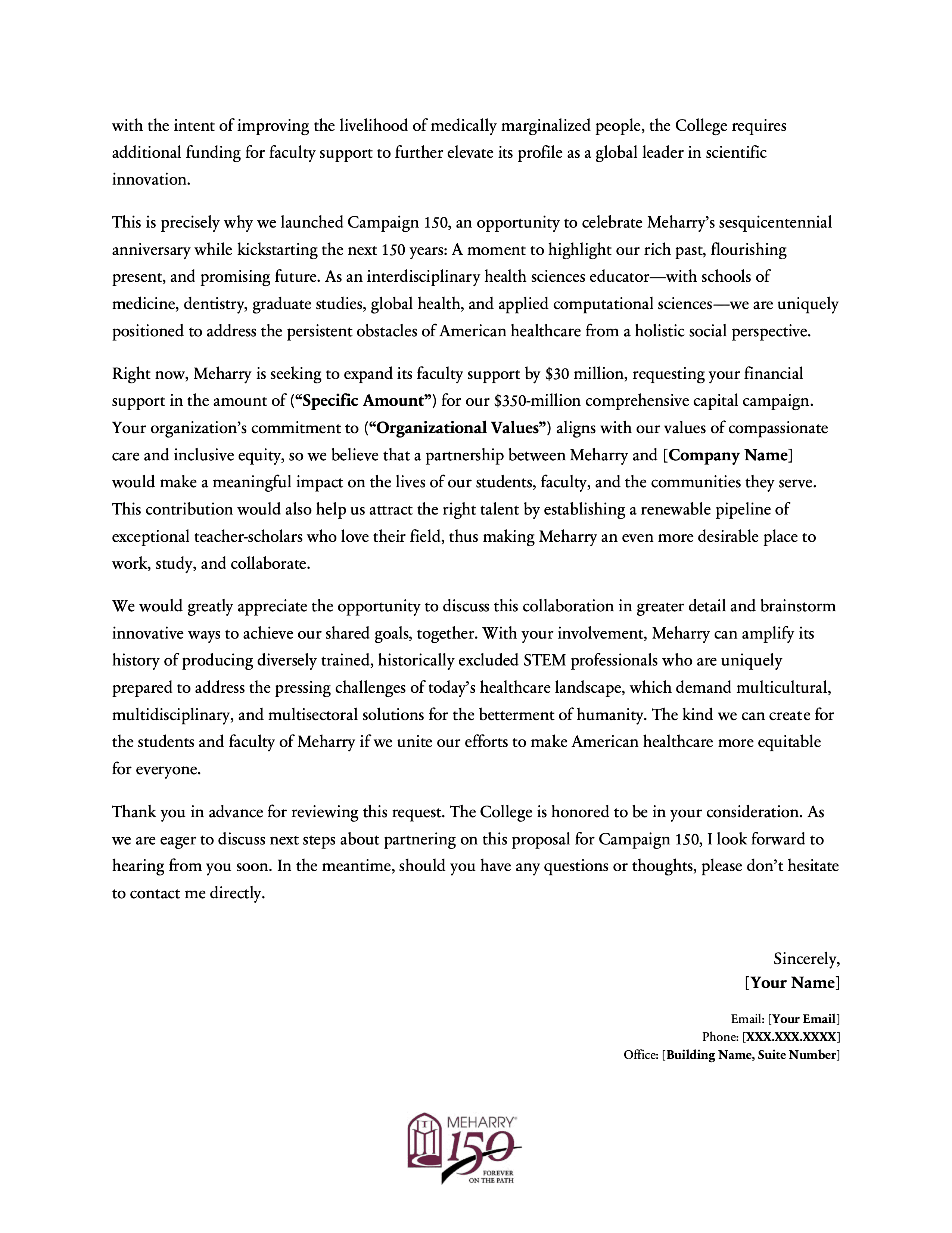 This project involved creating a modular series of six letters of inquiry for Meharry Medical College’s Campaign 150, each tailored to a distinct fundraising pillar: endowment, faculty support, program support, research facility development, scholarship support, and the Vision Fund. The series was designed to give development staff a flexible set of donor-facing templates that preserved institutional consistency while making it easier to customize outreach by funder interest, values alignment, and campaign priority. It reflects an approach to fundraising materials that emphasizes not just persuasive writing, but reusable messaging infrastructure that supports a broader advancement strategy.