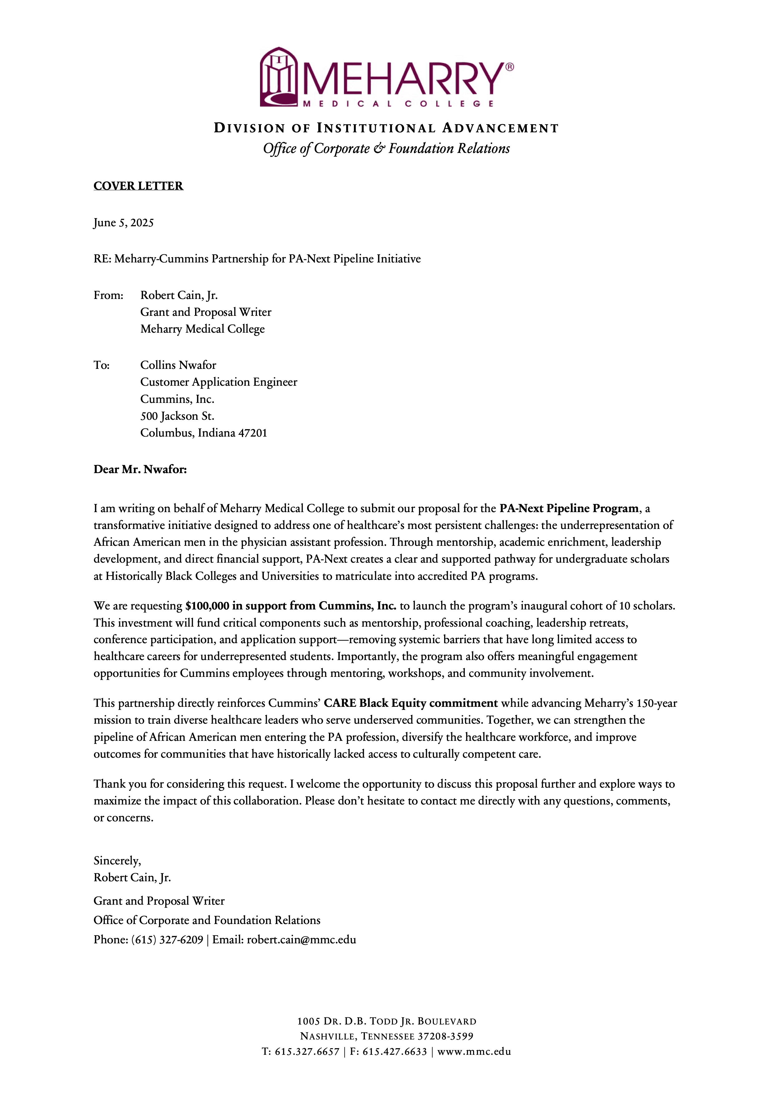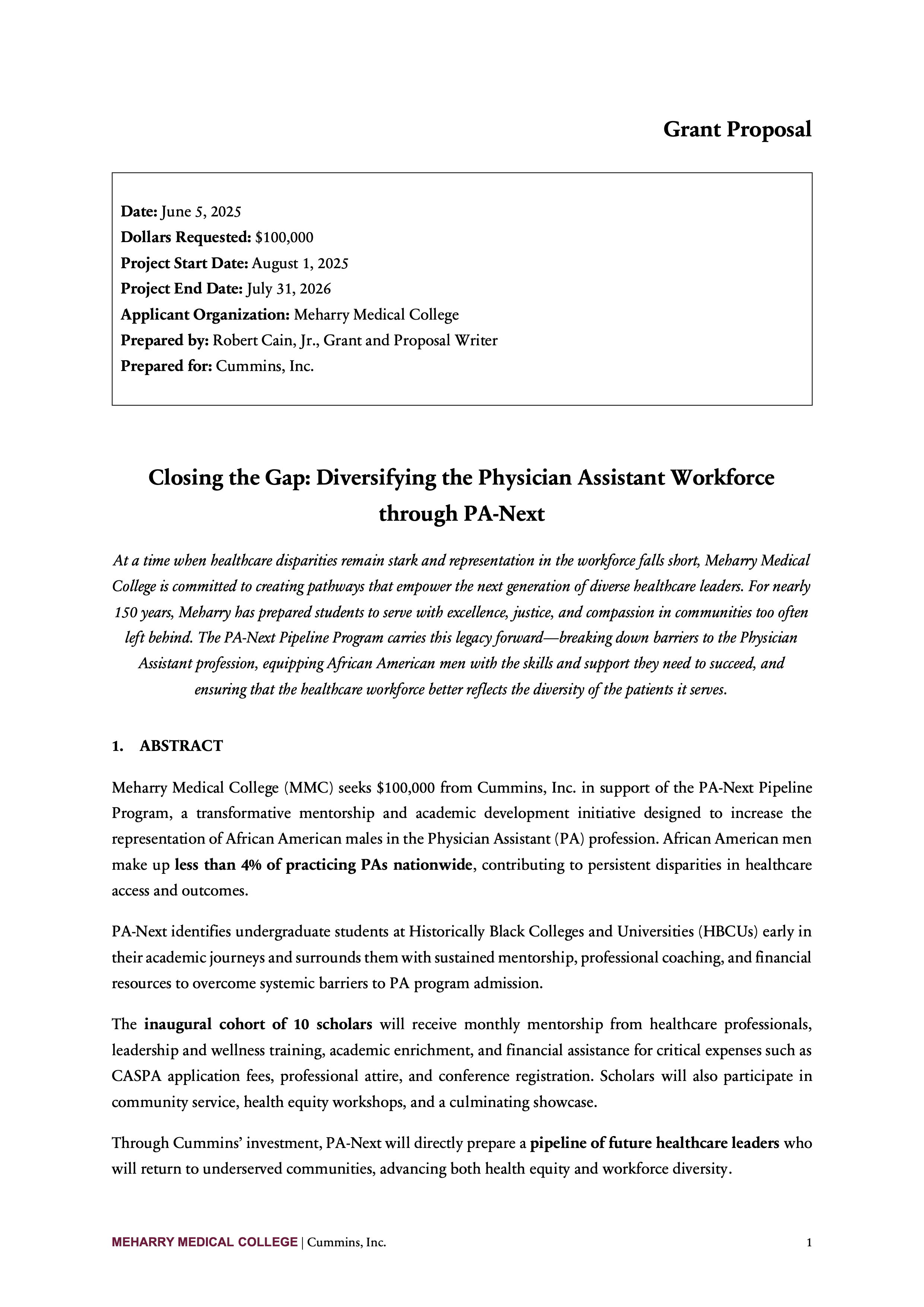 This proposal positioned PA-Next as a high-impact pipeline initiative designed to address the underrepresentation of African American men in the physician assistant profession through mentorship, academic enrichment, leadership development, and targeted financial support. The narrative aligned Meharry’s program model with Cummins’s racial equity and workforce development priorities, emphasizing both student outcomes and broader community impact. The request was fully awarded in the amount of $100,000.