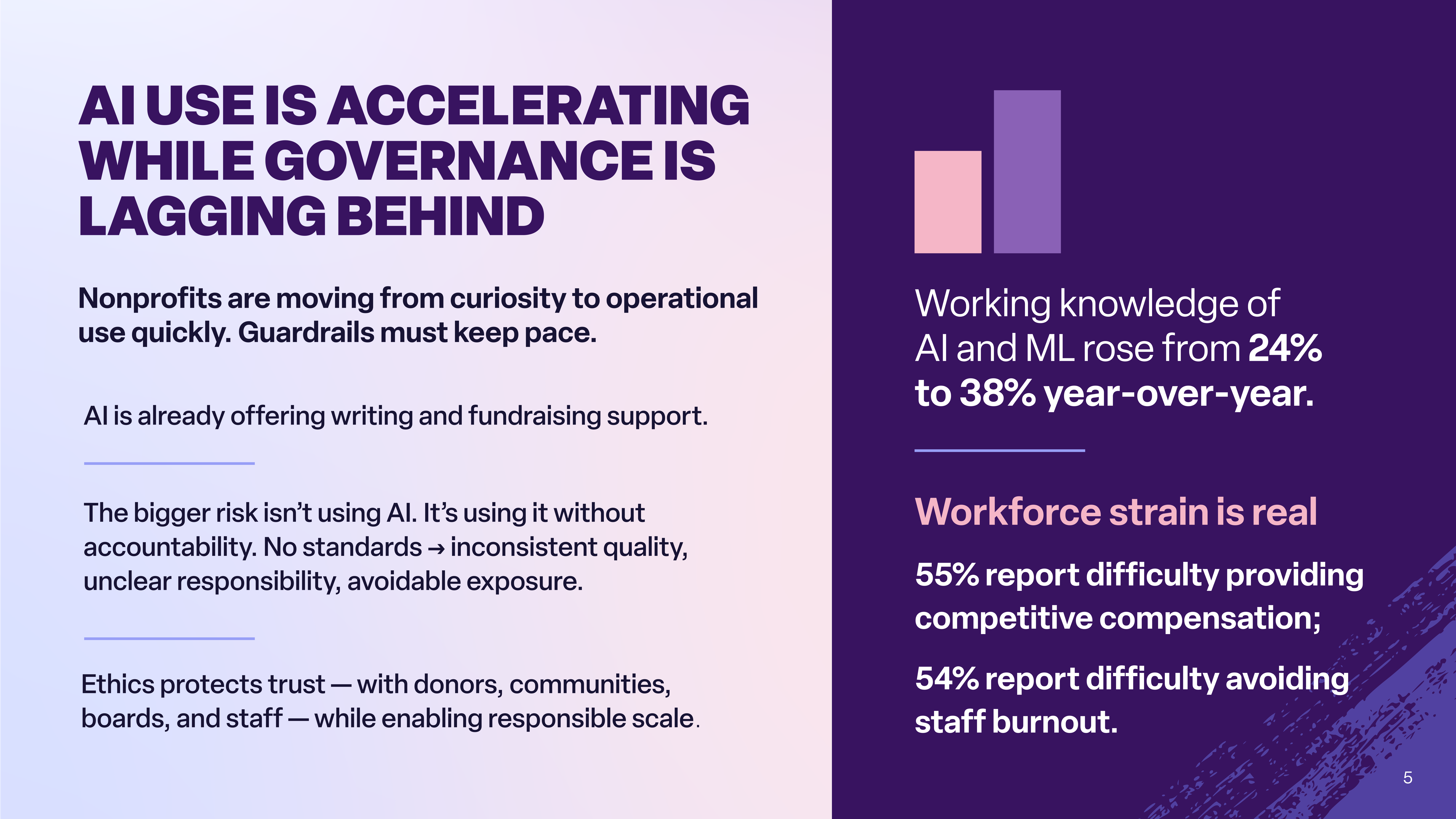 This executive briefing was designed to help nonprofit leaders move beyond abstract AI concerns and think more concretely about responsible adoption. It translates ethical AI into practical leadership questions around safeguards, accountability, vendor due diligence, staff use, and organizational readiness, while offering a clear set of near-term actions leaders can take to reduce risk and build trust. The piece positions ethical readiness not as a barrier to innovation, but as the foundation for scaling AI responsibly across the organization.