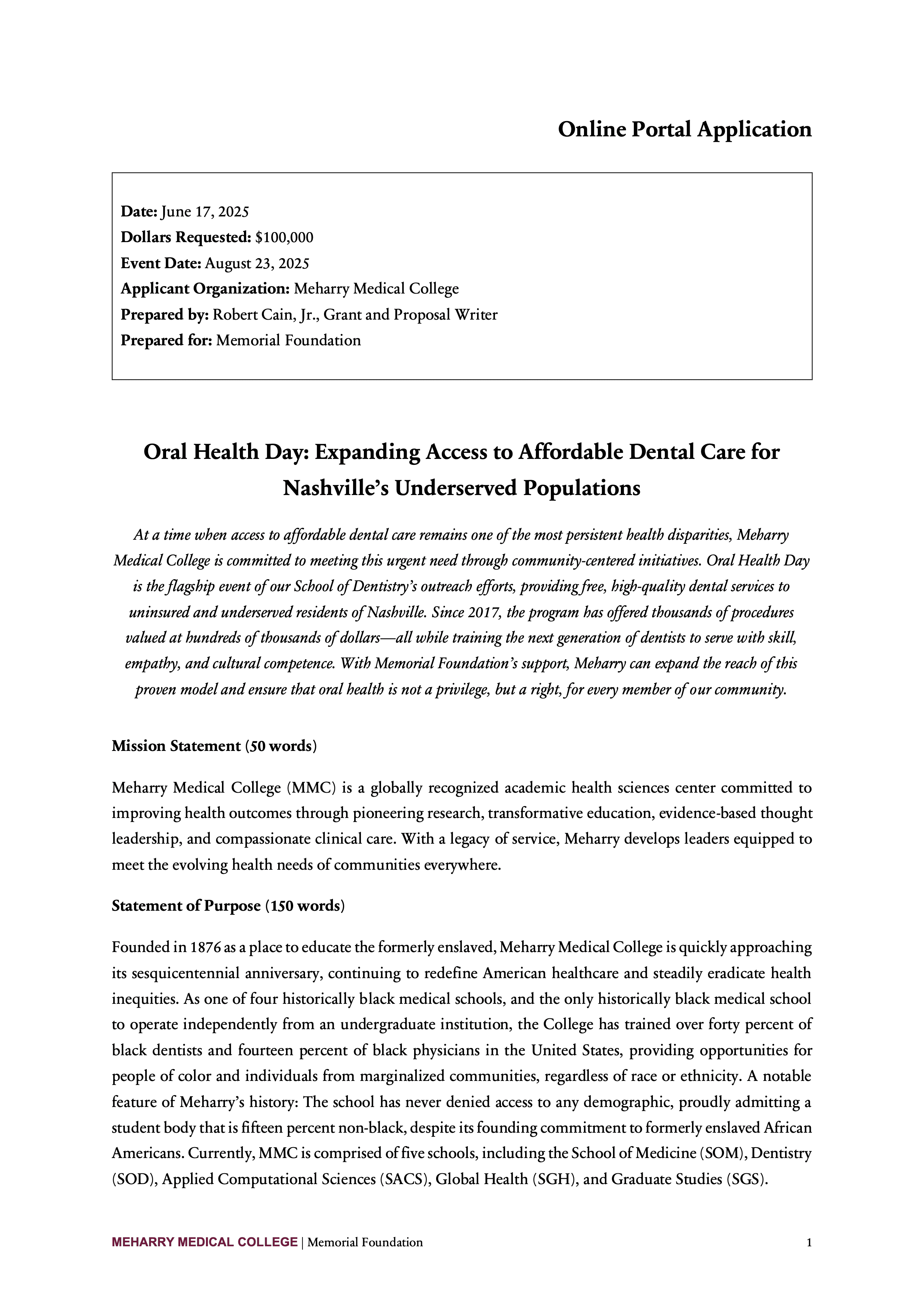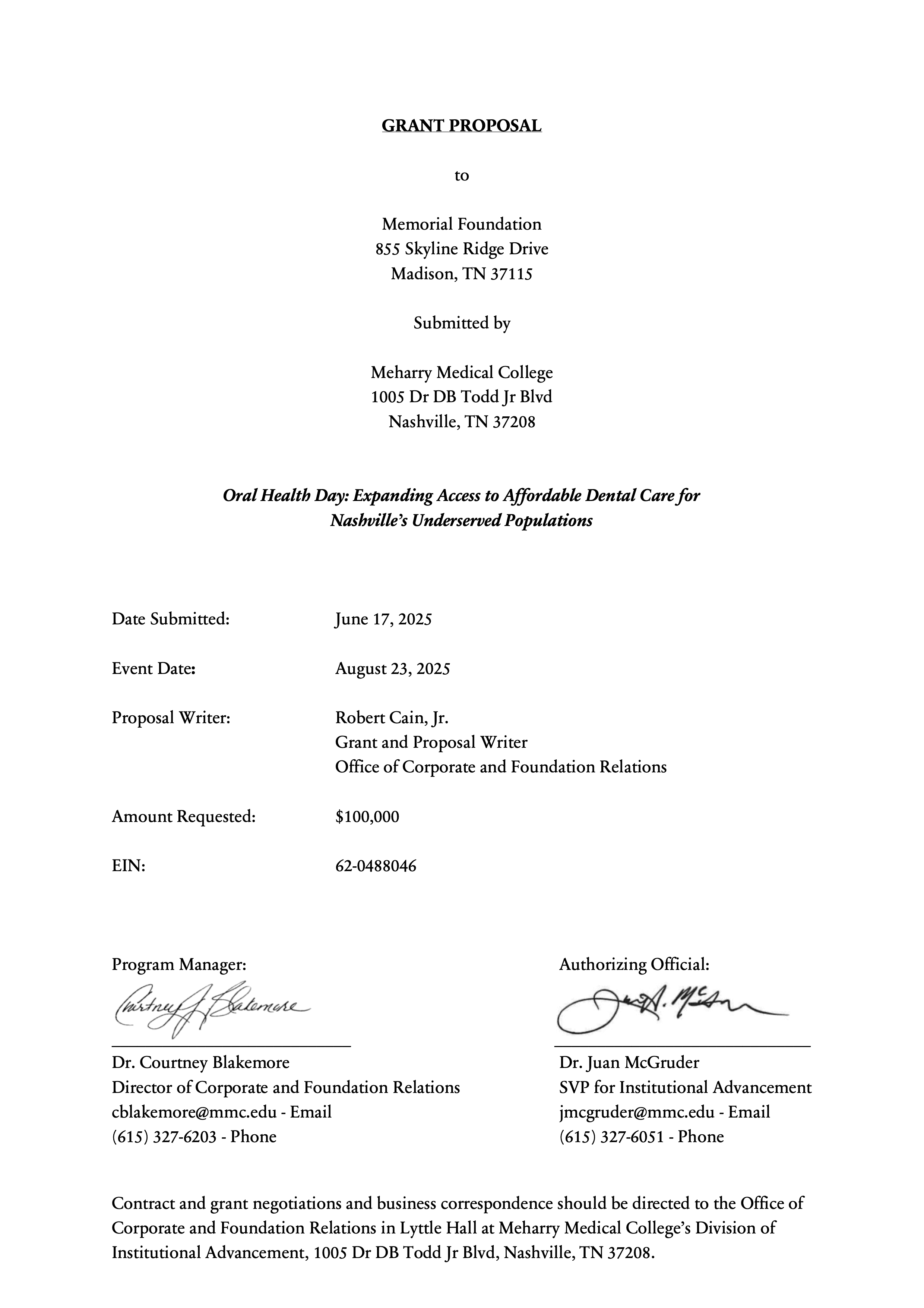 This proposal framed Oral Health Day as both a direct-service intervention and a health equity initiative, highlighting Meharry’s ability to deliver free, high-quality dental care to uninsured and underserved Nashville residents while training future providers in compassionate, community-centered practice. The narrative emphasized measurable outcomes, cost avoidance, and the value of reducing access barriers through preventive, restorative care. The request received $10,000 in funding.