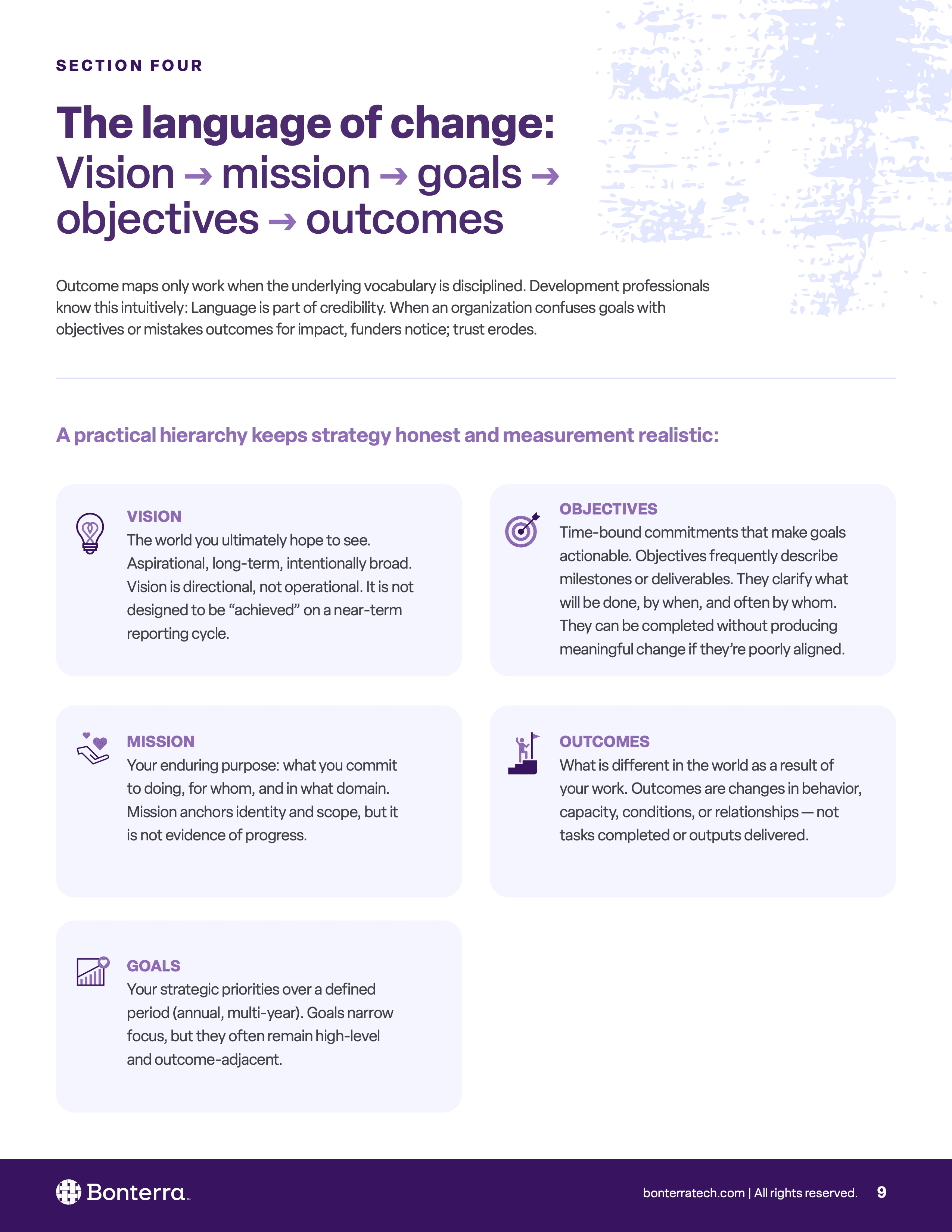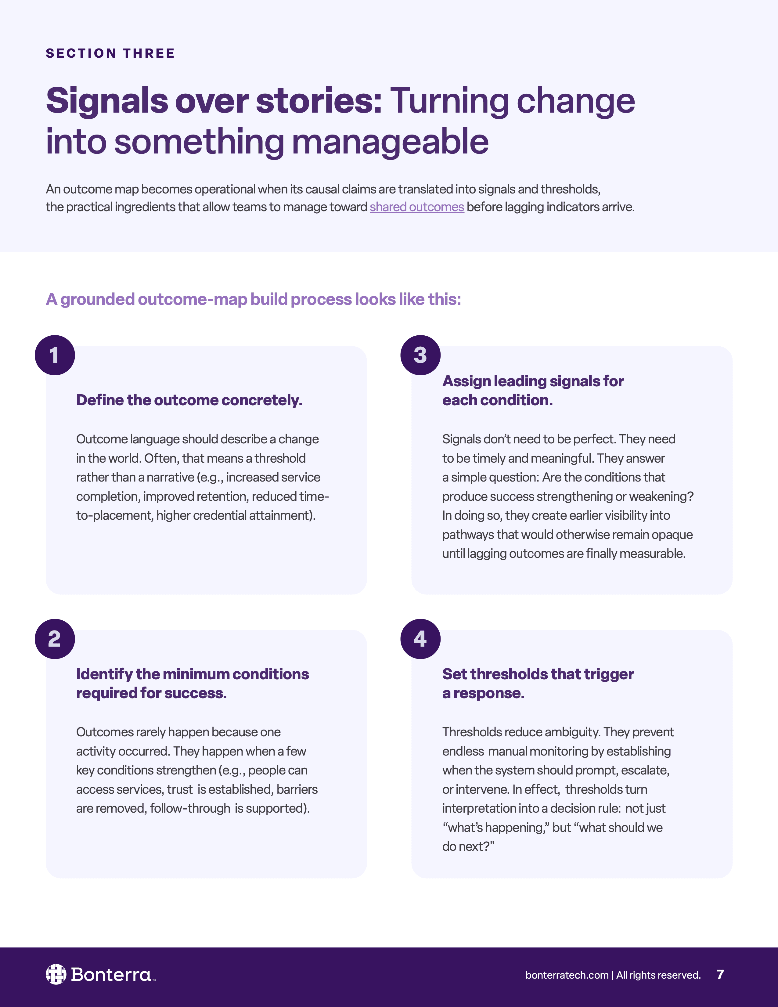 This whitepaper explores how social impact organizations can move from activity-based reporting to more outcome-oriented accountability. It introduces outcome maps as a way to make causal logic explicit, define what meaningful change looks like over time, and identify earlier signals before lagging indicators arrive too late to guide action. The piece connects strategy, measurement, fundraising, and program design, positioning outcome maps as a practical tool for managing progress more honestly and coherently across teams.