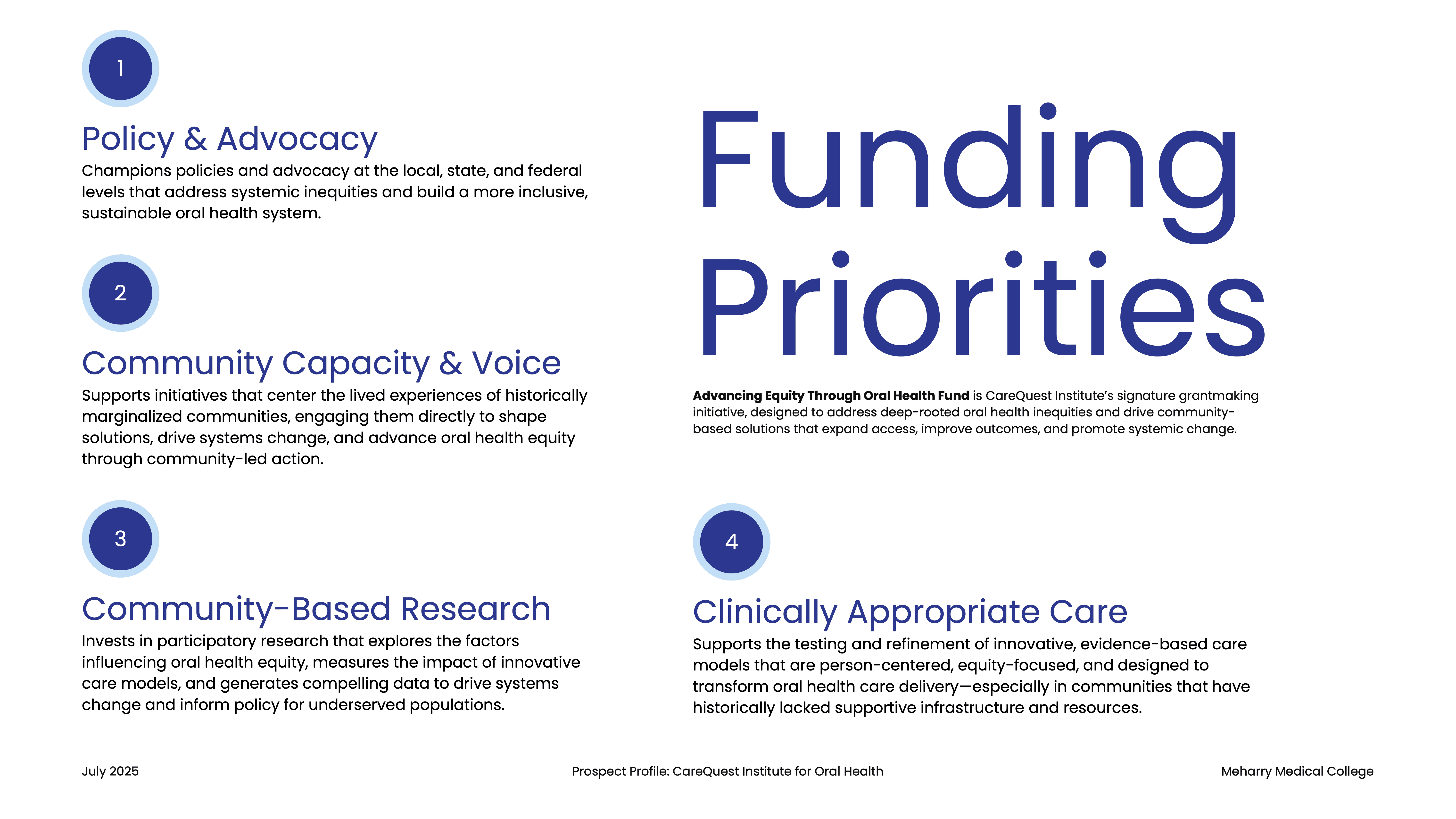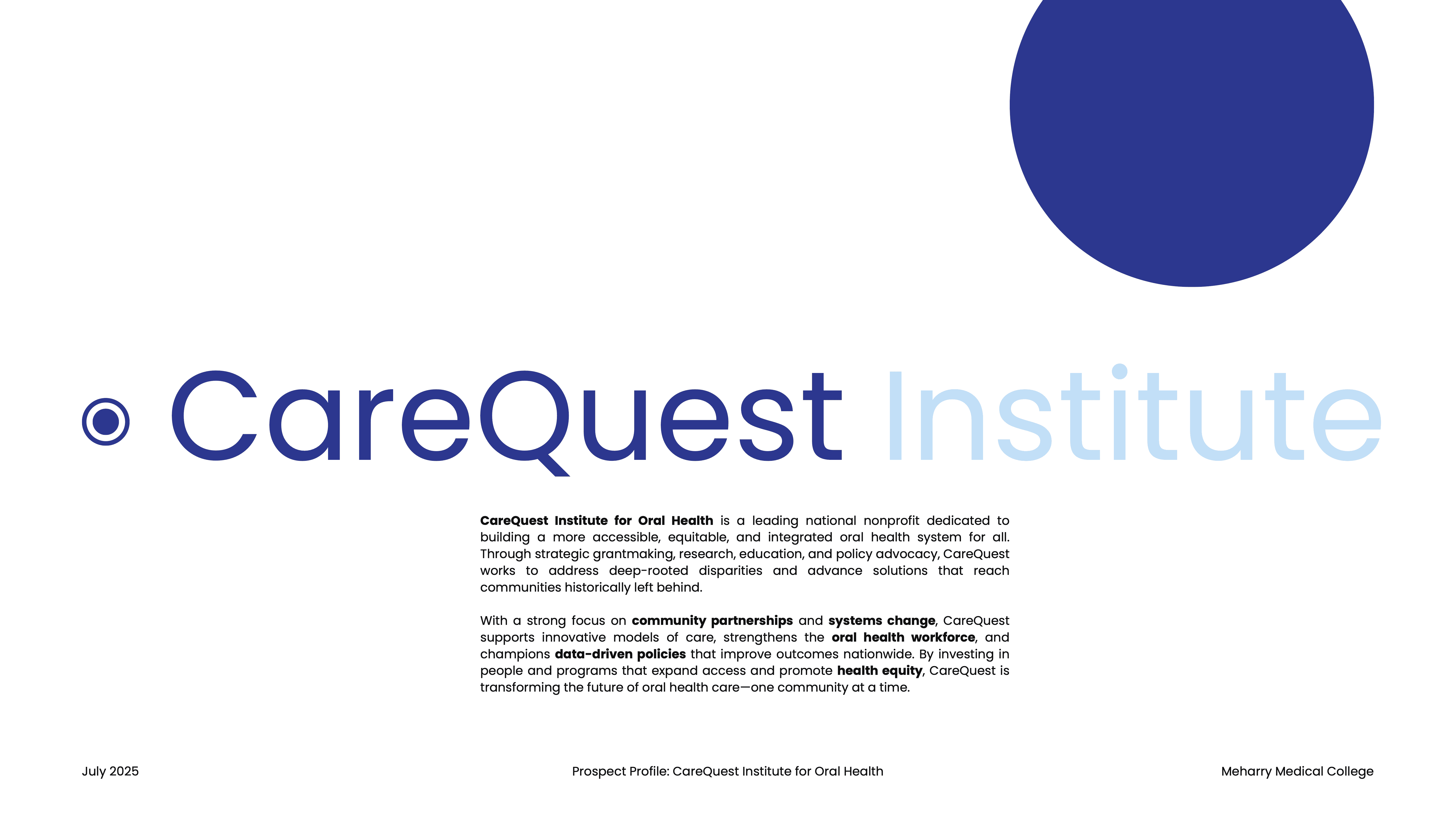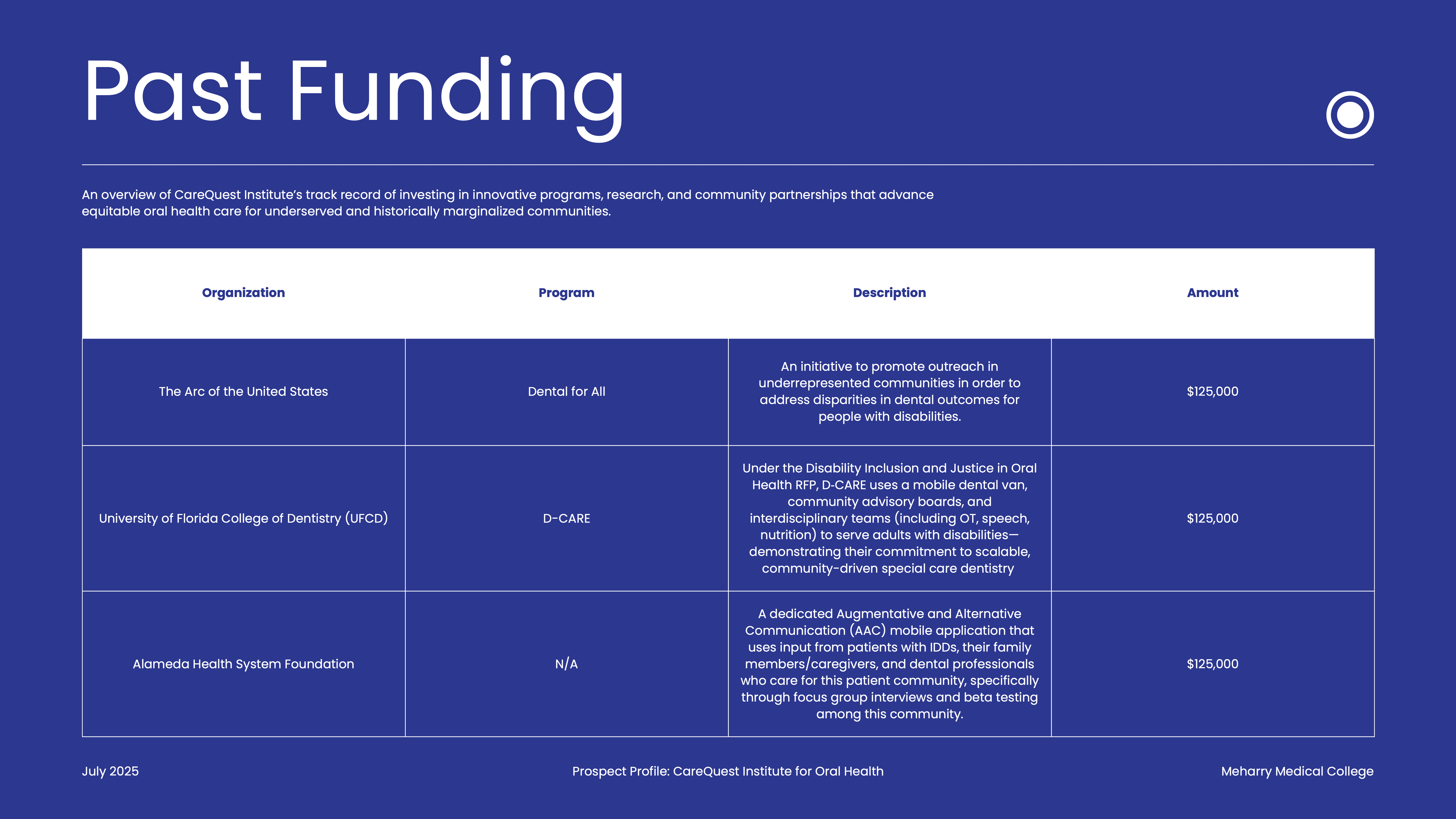 This prospect profile was designed to assess strategic fit between Meharry’s ABLE Clinic and CareQuest Institute for Oral Health by translating the clinic’s model into the funder’s language around access, community partnership, provider training, and systemic change. The deck combined funder research, program framing, past giving analysis, and a clear partnership pathway, including potential use cases for a $200,000 request and recommended next steps for cultivation. It demonstrates how prospect research can move beyond information gathering to become a practical tool for donor strategy and institutional positioning.
