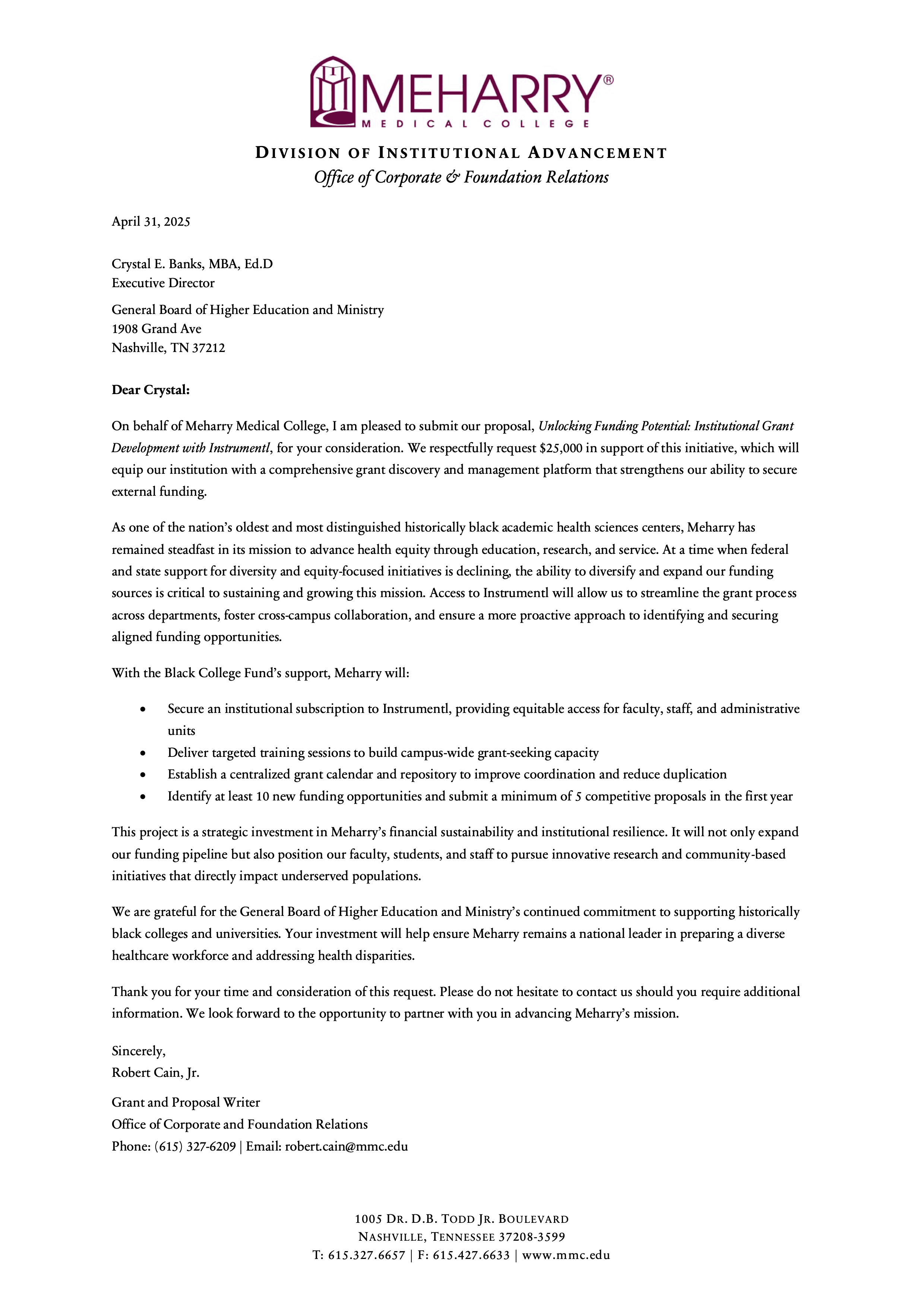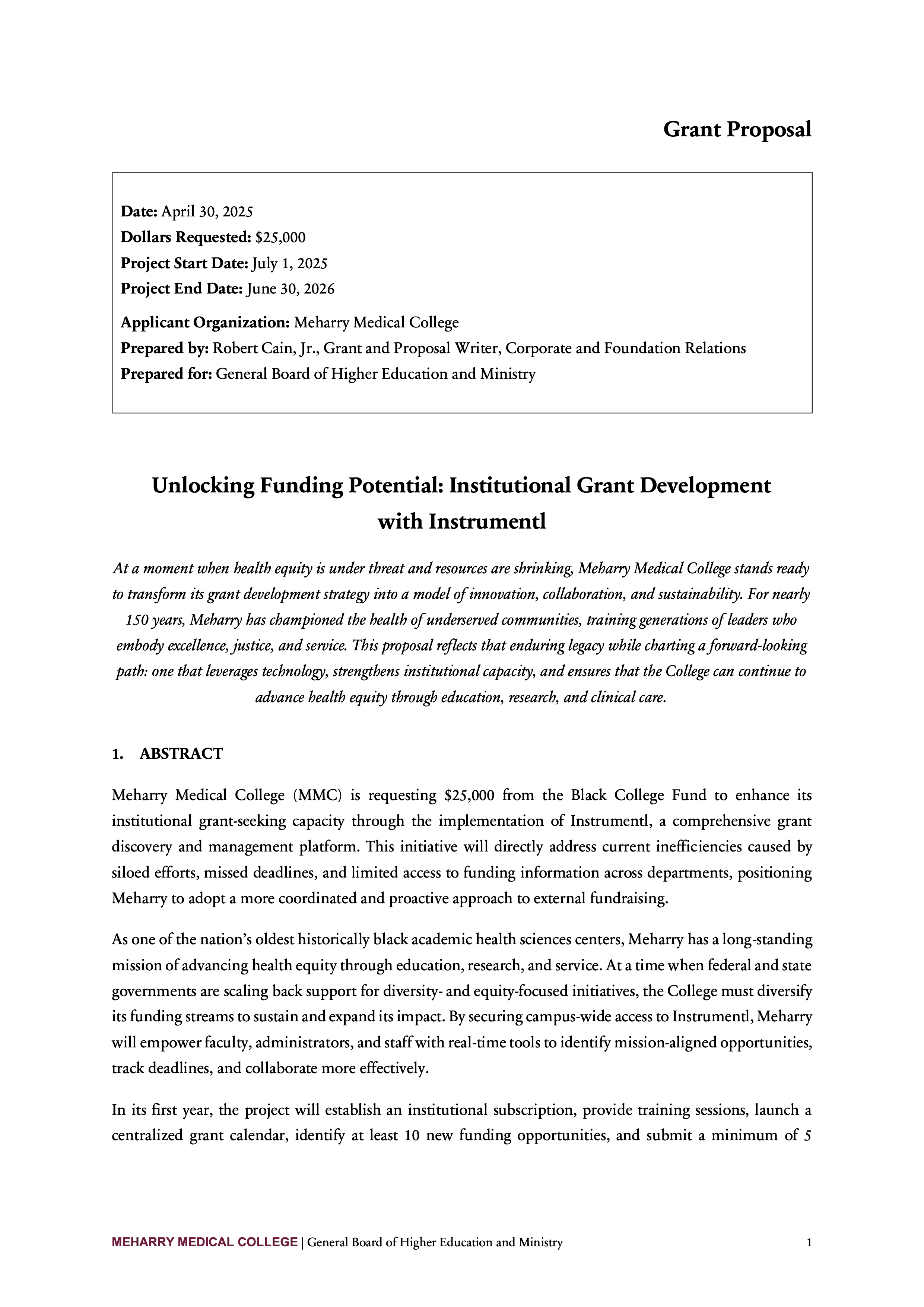 This proposal made the case for Instrumentl not as a technology purchase, but as core fundraising infrastructure tied to institutional resilience, cross-campus coordination, and long-term external revenue growth. Framed in the context of shrinking public support for equity-focused initiatives, the narrative connected grant systems to Meharry’s broader mission and financial sustainability. The request was fully awarded at $25,000.